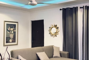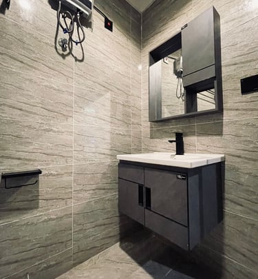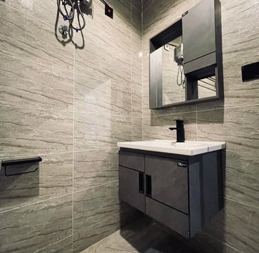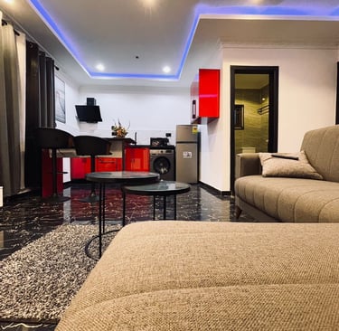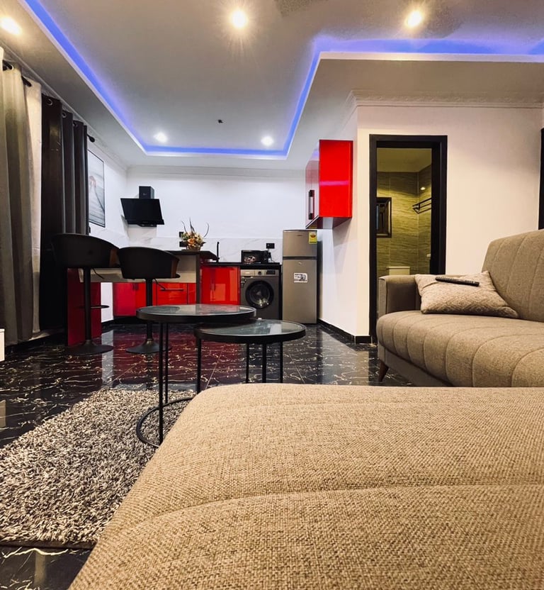 Step into elegance at Villa Casa Guesthouse, where contemporary design meets cozy relaxation. Our living space features a chic gray sectional sofa, accented with plush cushions, and a sleek round coffee table set on a textured rug for added warmth. The glossy marble-effect flooring and soft gray drapes create a sophisticated ambiance, while the recessed ceiling lighting with a calming blue glow adds a modern touch. Every detail is crafted to make your stay stylish and comfortable